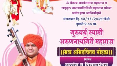 गुरूवर्य स्वामी अरूणनाथगिरी महाराज यांचा भव्य दिव्य अभिष्टचिंतन सोहळा व सत्संग विचार मंथन सोहळ्यासह विविध कार्यक्रमाचे आज मंगळवारी दुपारी ४…