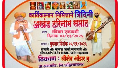 श्रीक्षेत्र ओझर बु येथे कार्तिक स्नान निमित्ताने त्रिदिनी अखंड हरिनाम सप्ताह भव्य दिव्य स्वरूपात आयोजन….