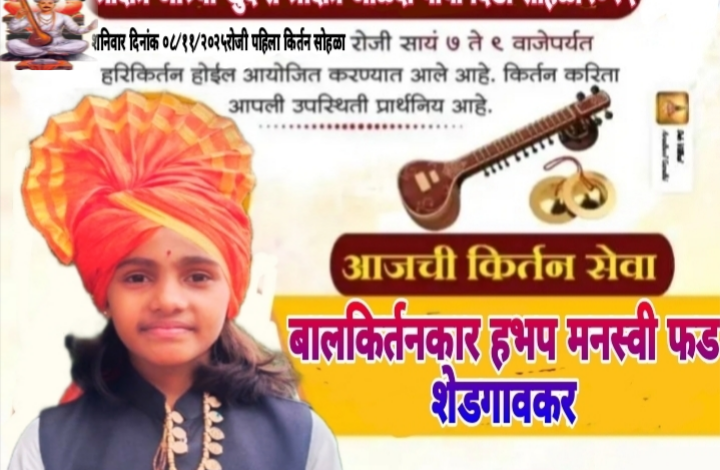 महाशक्ती न्युज (मुख्य संपादक भाऊसाहेब फड) अहिल्या नगर जिल्ह्यातील संगमनेर तालुक्यातील श्रीश्रेत्र आश्र्वी खुर्द येथील हभप सुनील महाराज पवार आश्र्वीकर व सौ.ज्योतीताई पवार आश्र्वीकर यांच्या मार्गदर्शनाखाली ज्ञानराज गुरू कुल शिक्षण संस्था आश्वी खुर्द तालुका संगमनेर जिल्हा अहिल्यानगर मधील व श्री संजय फड शेडगाव व फड परिवारातील सुकन्या मनस्वी संजय फड यांची आज शनिवार दिनांक ०८/११/२०२५ रोजी सायंकाळी ७ते९ यावेळेमध्ये व श्रीश्रेत्र आश्र्वी खुर्द ते श्रीक्षेत्र आळंदी पायी दिंडी सोहळा २०२५ यानिमित्ताने पिंपरणे येथे पेट्रोल पंप जवळ ठोंबरे वस्ती वर बाल किर्तनकार मनस्वी फड यांची पहिल्यांदाच किर्तन सेवा संपन्न होणार आहे.