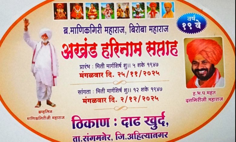 महाशक्ती Live न्युज (मुख्य संपादक भाऊसाहेब फड साहेब ओझरकर) अहिल्यानगर जिल्ह्यातील संगमनेर तालुक्यातील श्रीश्रेत्र दाढ खुर्द येथे श्रीगणेश, श्री बिरोबा महाराज, श्री.ज्ञानेश्र्वर महाराज,श्री महिपती महाराज, श्रीविठ्ठल रूक्मिणी,श्री.तुकाराम महाराज, सद्गुरू ब्रह् लिन नारायणगिरी महाराज,व सद् गुरू ब्रह लिन माणिकगिरी महाराज यांच्या कृपाशीर्वादाने व महंत गुरूवर्य रामगिरी महाराज व महंत गुरूवर्य दत्तगिरी महाराज यांच्या मार्गदर्शनाखाली ब्रह लिन सद् गुरू माणिक गिरी महाराज व बिरोबा महाराज अखंड हरिनाम सप्ताह वर्ष १९ वे मिती मार्गशीर्ष शु ५ शके १९४७ मंगळवार दिनांक २५/११/२०२५ते मिती मार्गशीर्ष शु १२शके १९४७ मंगळवार दिनांक ०२/१२/२०२५ प्रर्यत आयोजित करण्यात आला आहे.
