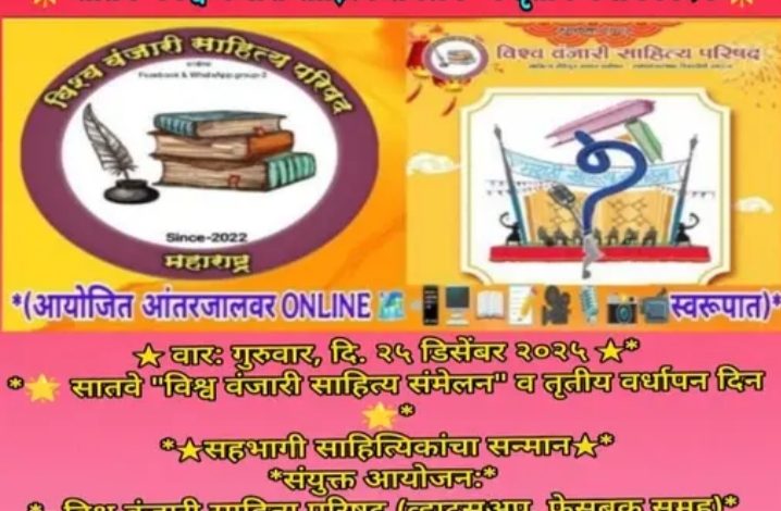 सातवे “विश्व वंजारी साहित्य संमेलन”२०२५ व तृतीय वर्धापन दिन उत्साहात साजरा होणार व सहभागी सर्व साहित्यिकांचा होणार सन्मान…..