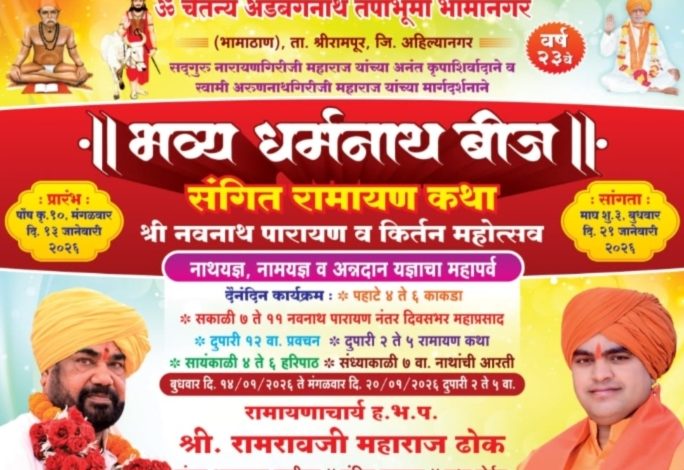 श्रीक्षेत्र भामाठाण अडबंगनाथ तपोभूमी येथे संगित रामायण कथा,श्री नवनाथ पारायण व किर्तन महोत्सव व भव्यदिव्य धर्मनाथ बीज सोहळ्यासह विविध कार्यक्रमाचे आयोजन…..