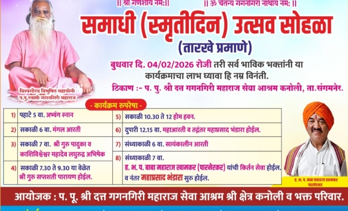 अहिल्यानगर जिल्ह्यातील संगमनेर तालुक्यातील श्रीश्रेत्र कनोली येथील प.पु.दत्त गगनगिरी महाराज सेवा भक्त आश्रमामध्ये आज बुधवार दिनांक ०४/०२/२०२६ रोजी दिवसभर विविध कार्यक्रमाचे आयोजन करण्यात आले आहे.
