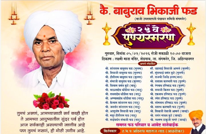 कै.बाबुराव भिकाजी फड (माजी उपसभापती पंचायत समिती सभापती) यांचे २५ वे पुण्यस्मरण सोहळा गुरुवार ०५/०२/२०२५ रोजी दुपारी १० वाजता शेडगाव येथे आयोजित करण्यात आले आहे याप्रसंगी अदिनाथ महाराज लाड आळंदीकर यांचे जाहीर हरी किर्तन सेवा संपन्न होईल.