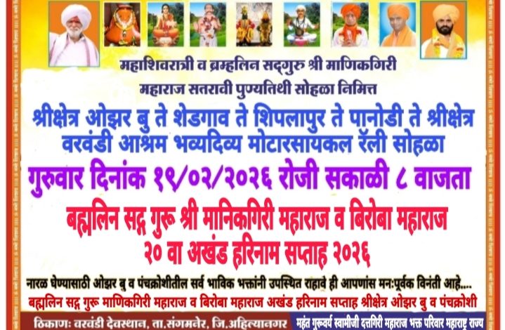 तसेच वरवंडी आश्रम येथे सर्वांनी उपस्थित राहुन २० वा अखंड हरिनाम सप्ताह २०२६ श्रीक्षेत्र ओझर बु व पंचक्रोशीत आणण्यासाठी प्रयत्न करून सप्ताहाचे नारळ घेऊनच यायचे आहे.असे आवाहन महा शक्ती न्युज चैनल यांच्या वतीने करण्यात येत आहे.
