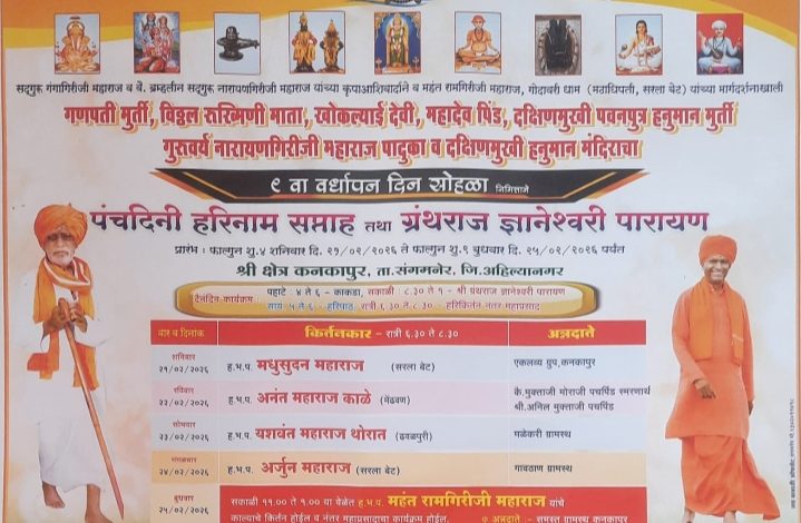 अहिल्यानगर जिल्ह्यातील संगमनेर तालुक्यातील श्रीश्रेत्र कनकापुर येथे ९ वा वर्धापनदिन व पंचदिनी हरिनाम सप्ताह व ग्रंथराज ज्ञानेश्वरी पारायण सह विविध कार्यक्रमाचे आयोजन करण्यात आले आहे.