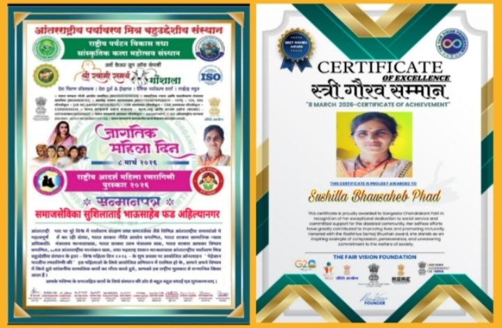 या सर्व कार्याची दखल घेऊन समाजसेविका सुशिलाताई भाऊसाहेब फड यांना जागतिक महिला दिनानिमित्ताने आदर्श महिला रणरागिणी पुरस्कार २०२६ व स्त्री गौरव सन्मान २०२६ या दोन्ही पुरस्काराने सन्मानित करण्यात आले आहे.